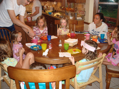 It was a flurry of activity this weekend at our house. We started out on Friday morning with phone call from our good friends, Kathleen and Scott. At 32 weeks pregnant, her water broke and sent her to the hospital. Of course we were concerned about her well being (she is fine--no baby as of yet, keep your fingers crossed that she can keep it in for a few more days!), but that meant that we picked up her hosting duties for our small college reunion! So we had 2 families staying with us on Friday night--4 extra adults and 7 extra kids. It was a blast! We all bunked up and put the kids in sleeping bags all over the place. Everyone did pretty well--except Annalise who was up at night because of a storm. Because of all the visiting and feeding of children, we didn't take many pictures. Sadly, this is all I have of our reunion.